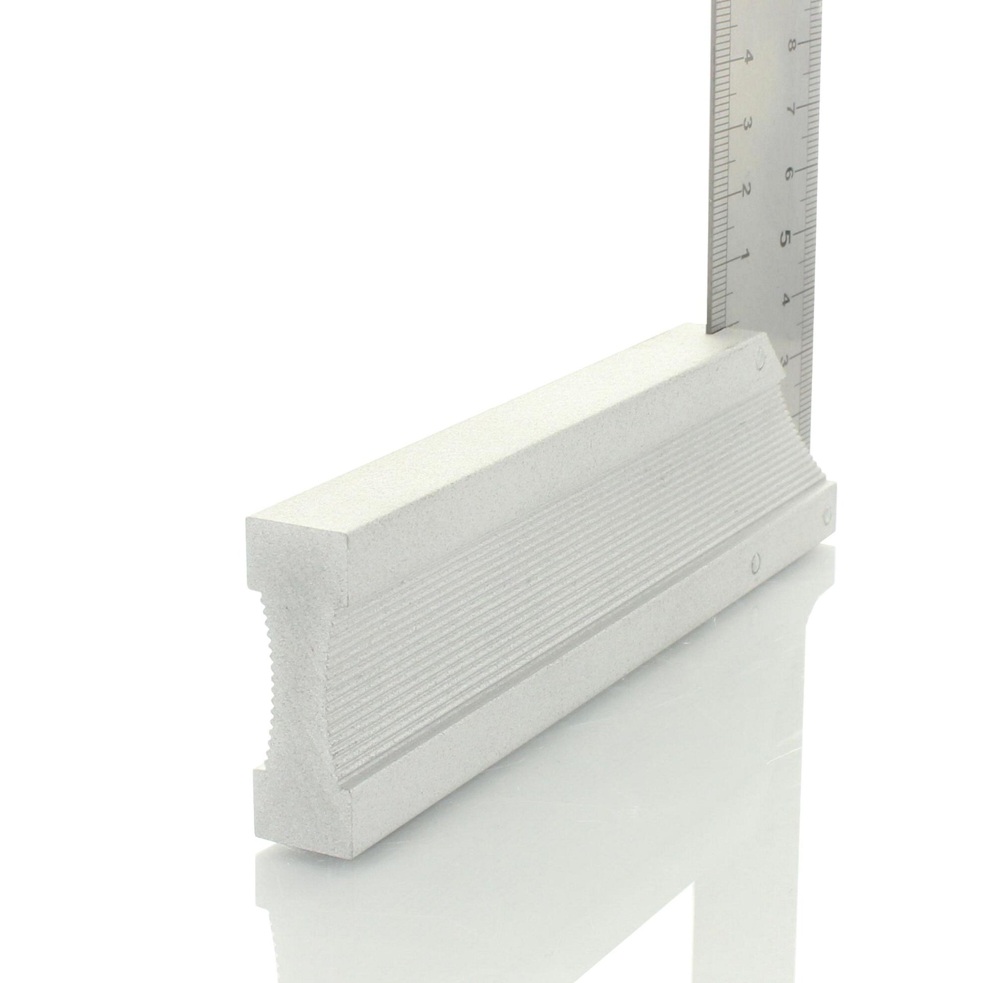 Der geriffelte Griff ist aus Vollaluminium gearbeitet und mit einem 45° Anschlag versehen. Die beidseitig geätzte Millimeterskala ist schwarz unterlegt und dadurch deutlich und blendfrei ablesbar. Die Skala ist abriebfest und am Außen- und Innenschenkel bei Null beginnend.