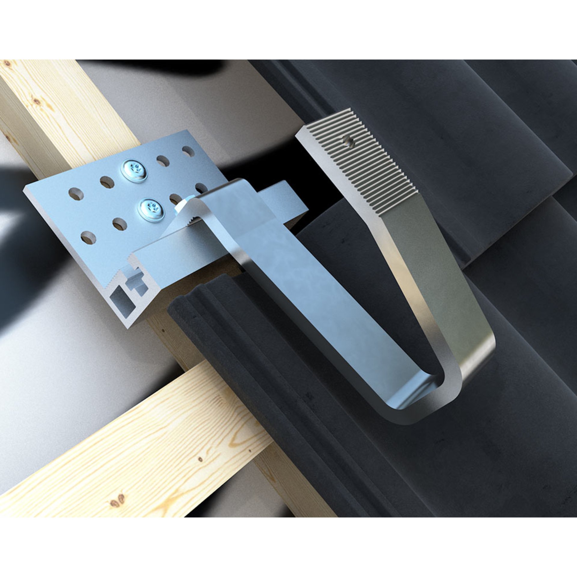 Der Dachhaken LayTec dient zur Montage von Solarpaneelen in Kombination mit dem Einlegesystem LayTec. Durch unser T40 ONLY System benötigen Sie zur Montage nur noch ein TX 40 Werkzeug. Das Einlegesystem LayTec muss nur einmal ausgerichtet werden und anschließend können alle Solarmodule nacheinander eingelegt werden. Dadurch wird wertvolle Arbeitszeit und Aufwand eingespart. Durch die Geometrie des Hakens lässt sich die Position des Bügels einfach justieren und befestigen. Durch den Bügel aus Edelstahl kann der Dachhaken besonders hohe Kräfte aufnehmen und ist damit auch für Gebiete mit hohen Wind- und Schneelasten geeignet.