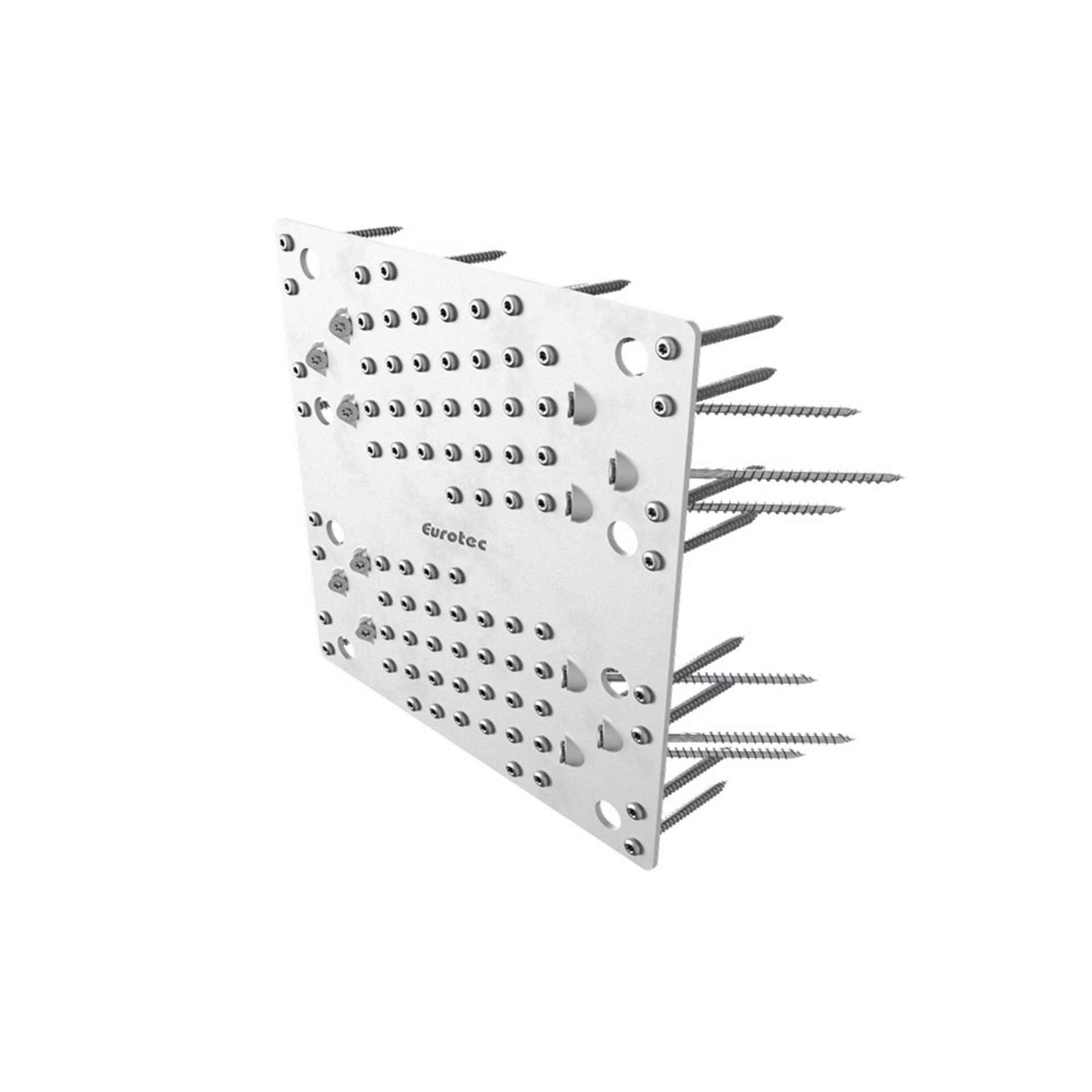 Für die Befestigung im Holz sind pro Seite 41 gerade Löcher und 6 Schrägverschraubungslöcher vorhanden, die wahlweise mit Ankernägeln oder Winkelbeschlagschrauben (WBS) fixiert werden. In Abhängigkeit von der Nutzung sind zwei weitere Befestigungslöcher vorhanden, die zusätzlich zur statischen Berechnung zur Verfügung stehen. Für die Fixierung im Beton stehen die vorgesehenen Löcher mit Ø 14 mm zur Verfügung, welche mit Bolzenankern oder der Rock-Betonschraube befestigt werden.