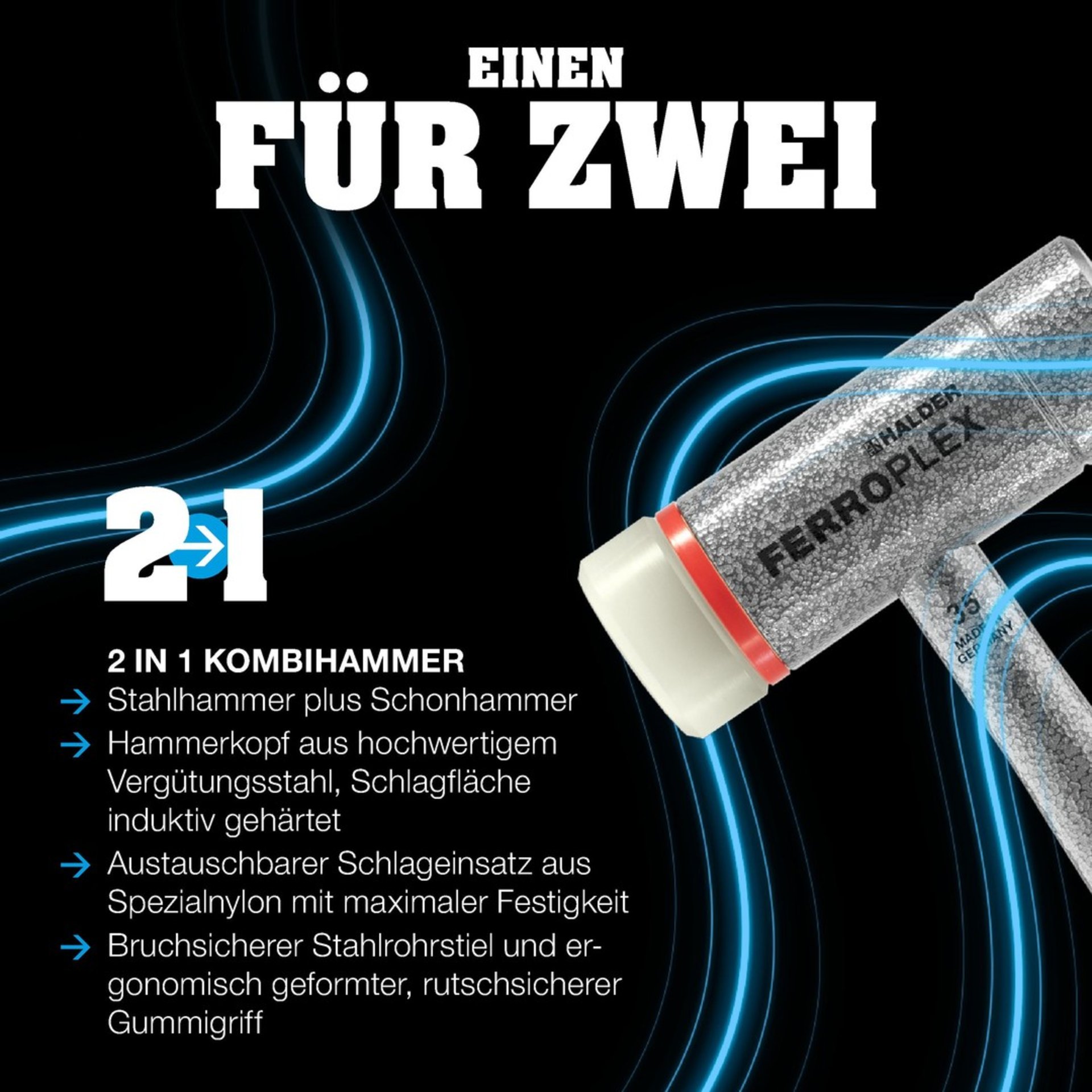 FERROPLEX ist der 2 in 1 Kombihammer von Halder für alle diejenigen, die weder auf die Vorteile eines Stahlhammers noch auf die Vorzüge eines Schonhammers verzichten wollen.