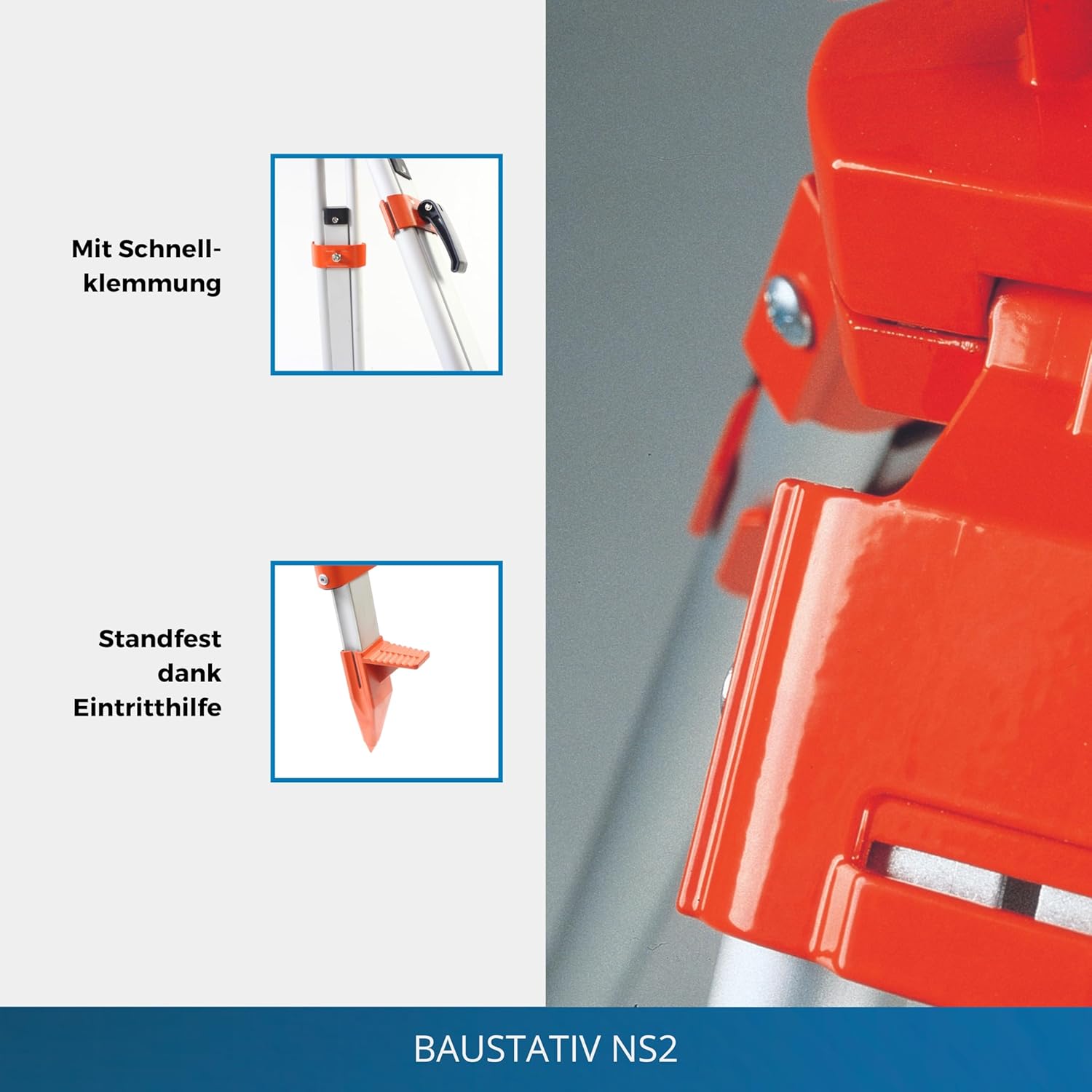 Die mittelschweren Nivellierstative eignen sich dank der flachen Stativteller sowohl für Bau- und Ingenieurnivelliere als auch für Rotationslaser. Ein Durchlass ermöglicht die Verwendung eines optischen Lotstrahls. Das verarbeitete Aluminium verleiht dem Stativ eine hohe Robustheit und Wetterbeständigkeit. Über die Eintritthilfe lassen sich die Stativbeine auch in unwegsamen Gelände standfest positionieren.