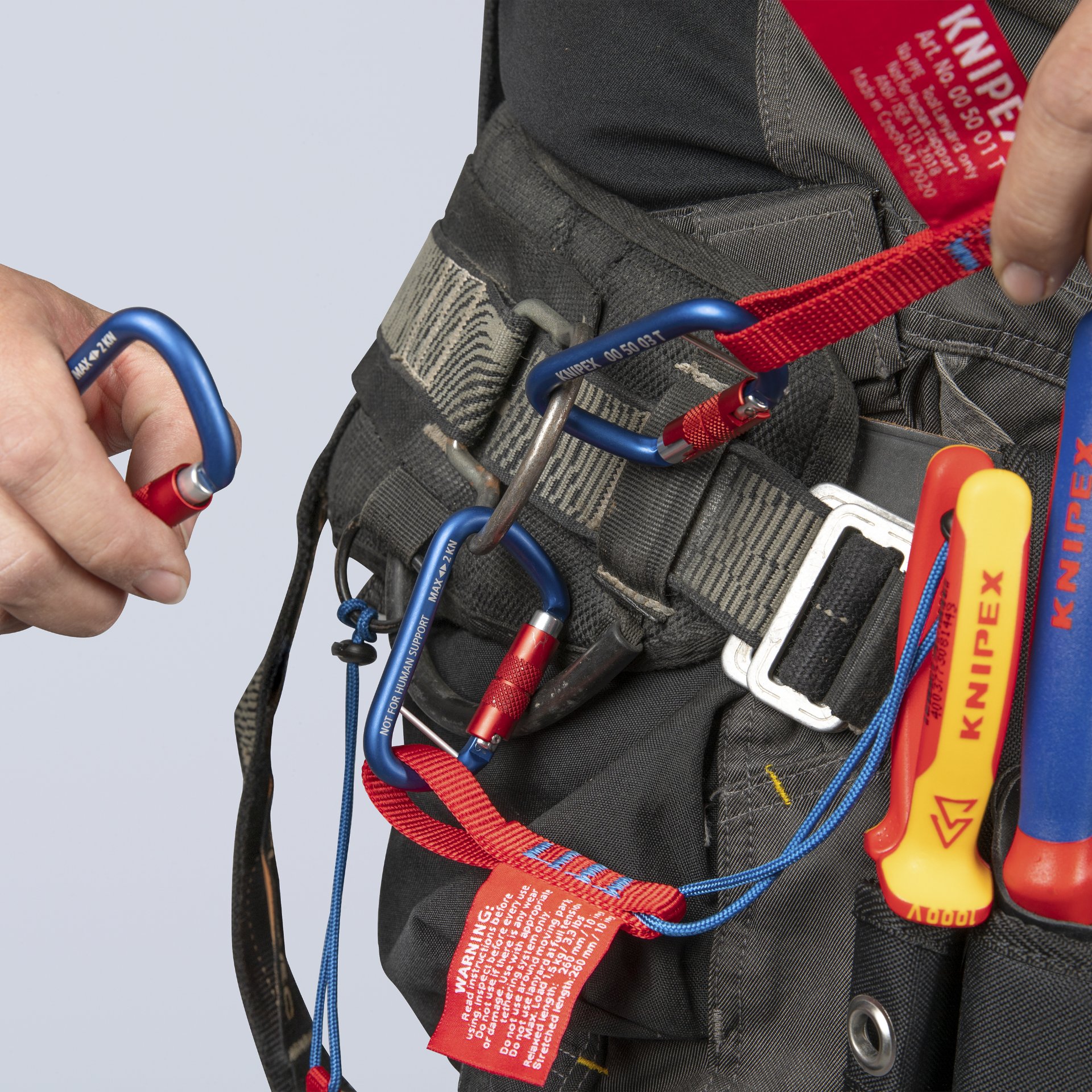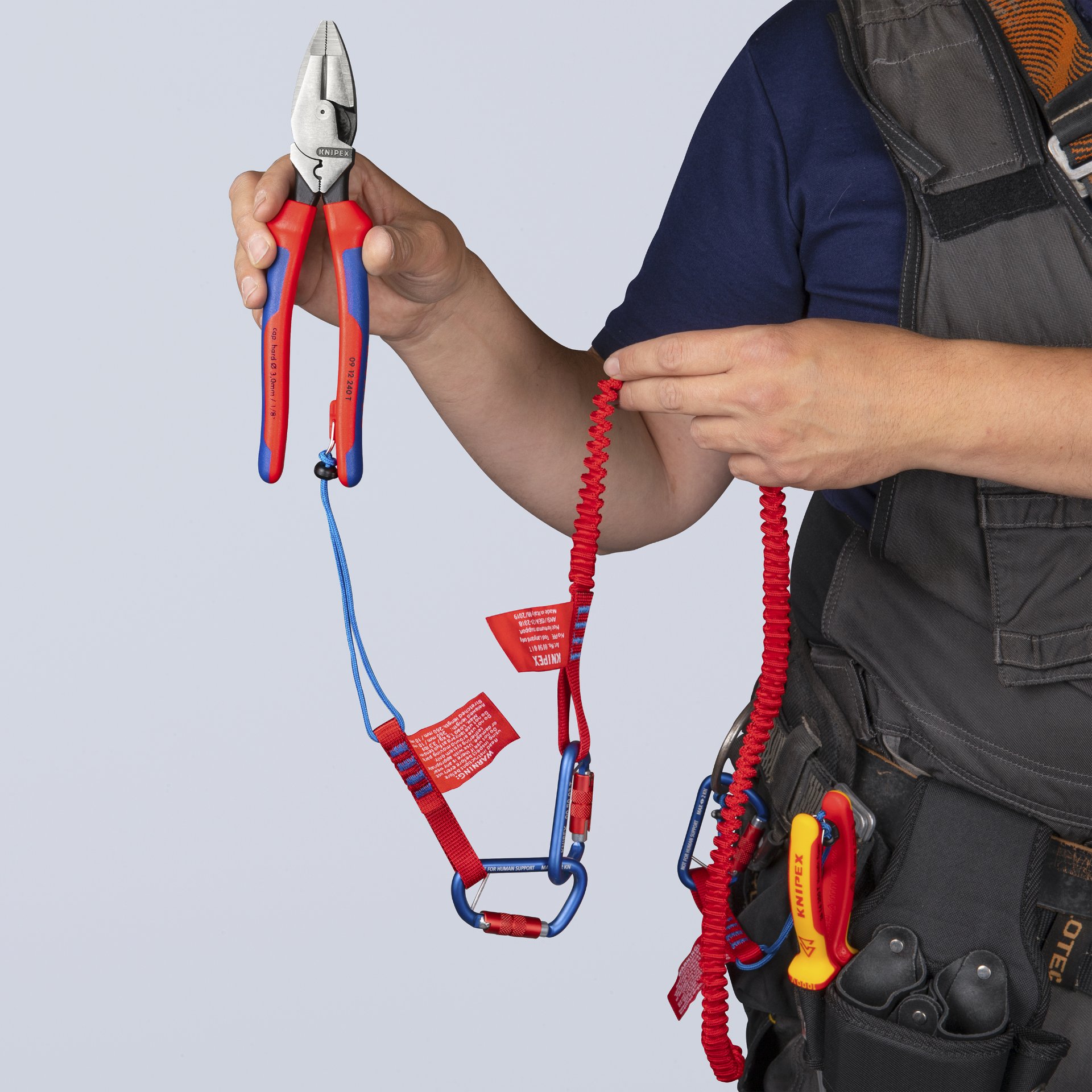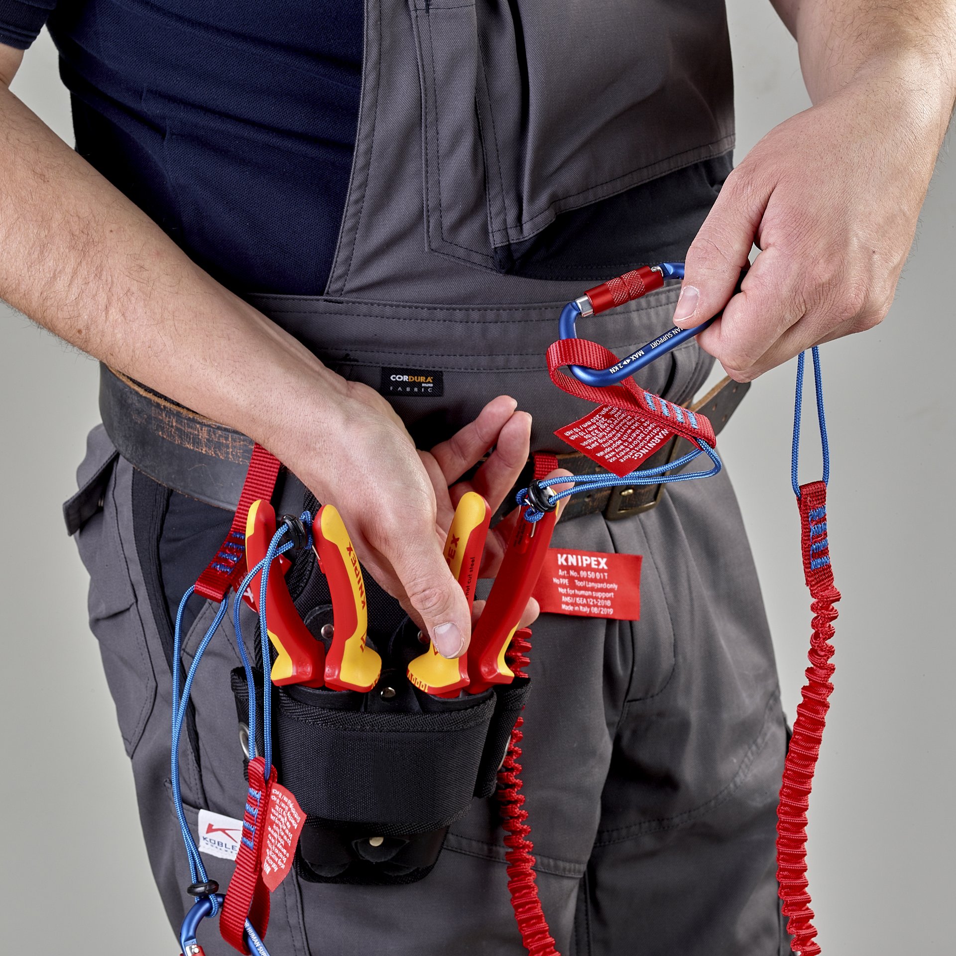 00 50 01 T BK Fangleine Für die zuverlässige Werkzeugsicherung: In zahlreichen Falltests überprüfte Haltbarkeit für Werkzeuge bis 1,5 kg. großer Arbeitsradius: lange Fangleine für bequemes Arbeiten. Verringert die Risken des Werkzeugverlustes, der Verletzung von Lebewesen sowie der Beschädigung von Gegenständen. Für Arbeiten in Höhe, Tiefe oder an Seilen: für Industrieklettern, Schachtarbeiten, Rettungsdienste, Baumpflege, Brückensanierung, Windkraft oder auf See. Fangleine lässt sich direkt mit der Kordelseite oder dem Karabiner an der Kletterausrüstung oder dafür vorgesehenen Fixpunkten befestigen, schneller Wechsel der Sicherung von der Werkzeugtasche zur Fangleine. Die ca. 90 cm lange Fangleine aus gerafftem Gewebeband dehnt sich bei Belastung auf eine Länge von bis zu ca. 1,5 m aus. Mit Schlaufe aus vernähtem Flachgurt an einem Ende und eingenähter Kordel mit Kordelstopper am anderen Ende. Passend für alle KNIPEX-Zangen mit Befestigungsöse. Keine PSA (persönliche Schutzausrüstung): nicht geeignet zur Personensicherung!. - Belastbarkeit: 1,5 kg / 3,3 lbs