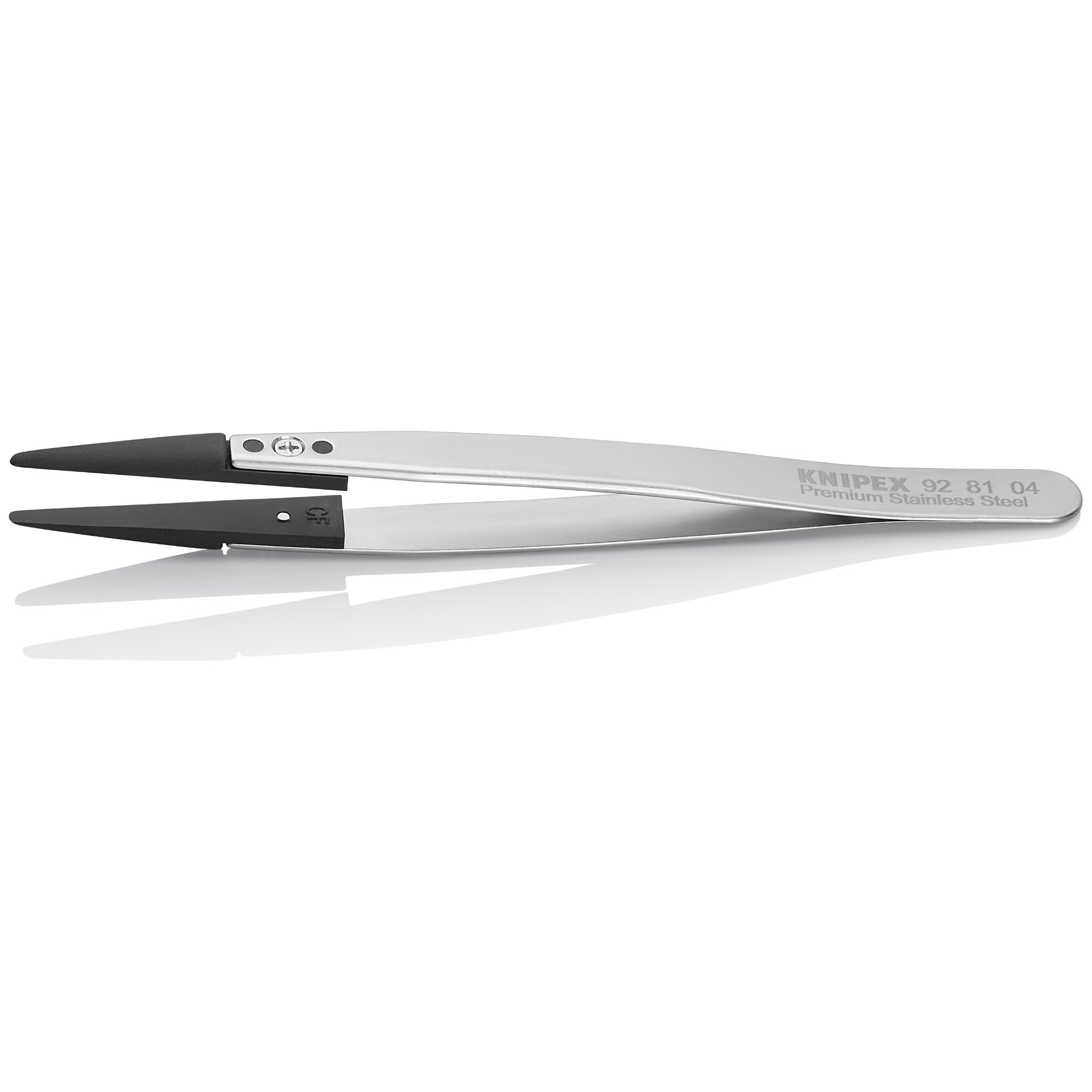 92 81 04 Pinzette mit Wechselspitzen ESD Für besonders anspruchsvolle Feinarbeiten: mit hoher Korrosionsbeständigkeit und Zähigkeit. Maximal oberflächenschonend für die Handhabung empfindlicher elektronischer Komponenten, mikro-mechanischer Teile sowie von Glas- und Keramikbauteilen. Für Elektronik- und Feinmechanikindustrie, Uhrenhersteller, Juweliere. In Handarbeit gefertigte Grundkörper: mit polierten Kanten und hervorragend mattierter, kratz- und spiegelfreier Oberfläche. Grundkörper aus hochwertigem Premium-Edelstahl: hohe Temperaturbeständigkeit und exzellente Korrosionsbeständigkeit gegenüber den meisten Chemikalien, Salzen und Säuren. Die Wechselspitzen bestehen aus 30% kohlenstofffaserverstärktem Kunststoff: elektrisch und thermisch sehr gut leitfähig, kratzsicher und mit hohem Abriebwiderstand. Die austauschbaren, kohlenstofffaserverstärkten Kunststoffspitzen haben einen Oberflächenwiderstand zwischen 10^2 und 10^4 Ohm zum kontrollierten Ausgleich von Potenzialunterschieden zwischen Bediener und elektronischen Bauteilen. Die Wechselspitzen sind dauerhaft temperaturstabil bis 130 °C, kurzfristig bis zu 190 °C. Die kohlenstofffaserverstärkten Kunststoffspitzen sind vollelastisch, ermüdungsbeständig, vibrationsdämpfend sowie wasserabweisend. Gute chemische Beständigkeit der Spitzen gegenüber den meisten Ölen, Fetten, Kraftstoffen und unpolaren Lösungsmitteln. Mit der Genauigkeit und Stabilität einer regulären Pinzette: Die Kunststoffspitzen haben eine spielfreie 3-Punkte-Verbindung (2 Fixierungen an den Stegen, eine Schraube), die dem Benutzer eine perfekte und spielfreie Befestigung am Grundkörper garantieren. Mit Sparpotential: Das Spitzensortiment umfasst eine Auswahl an unterschiedlichsten Formen. Je nach Anwendung müssen lediglich Spitzen nachgekauft werden. - Oberfläche: Mattiert - Ausführung: Gerade - Spitzenbreite (A): 1mm - Spitzenbreite (B): 2mm - Ausführung Pinzettenspitze: Stumpf - Korrosionsbeständig: ja - Säurebeständigkeit: Sehr gut - ESD-geprüft: ja - VDE-geprüft: nein - Branchen: Industrie Elektronik Uhrenhersteller Juwelier - Magnetisch: Nicht magnetisierbar (80%) - Verhalten: ableitend