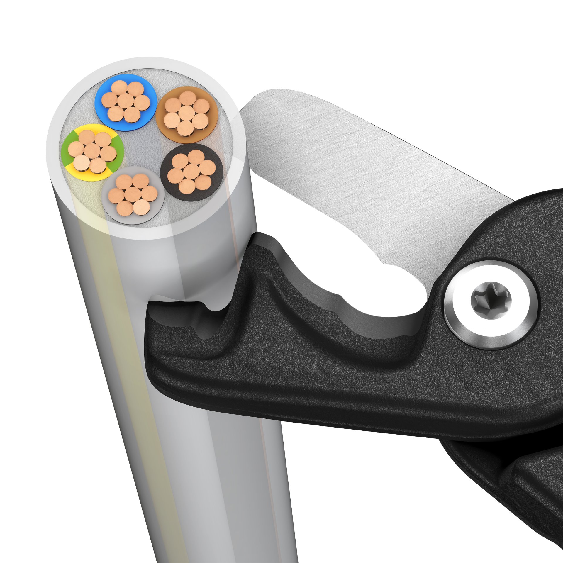95 18 225 KNIPEX StepCut® XL Mit Kraftgelenk, langen Schenkeln und optimierten Schneiden: spürbar leichterer Schnitt als mit kompakten Kabelscheren. Enorme Kapazität: trennt eindrähtige Kabel aus Kupfer oder Aluminium bis 35 mm², mehrdrähtig bis 70 mm² und feindrähtig bis 120 mm². Zwei Schneidbereiche: Die abgestufte Hauptschneide hält kleinere und größere Kabel beim Schnitt stets maximal gelenknah, die Frontschneide dient zum schrittweisen Trennen („Knabbern”) sehr großer Kabel. Komfortable Einhand- und Zweihandbedienung auch bei großen Kabeldurchmessern durch minimierte Schenkelweite. Geschraubtes Kraftgelenk: hochübersetzt, leichtgängig, nachstellbar. Schlanker Kopf für bessere Zugänglichkeit. Klemmschutz für sicheres Arbeiten. Nicht geeignet für stahlverstärkte Kabel, etwa ACSR. Schneiden zusätzlich lasergehärtet, Schneidenhärte ca. 56 HRC.