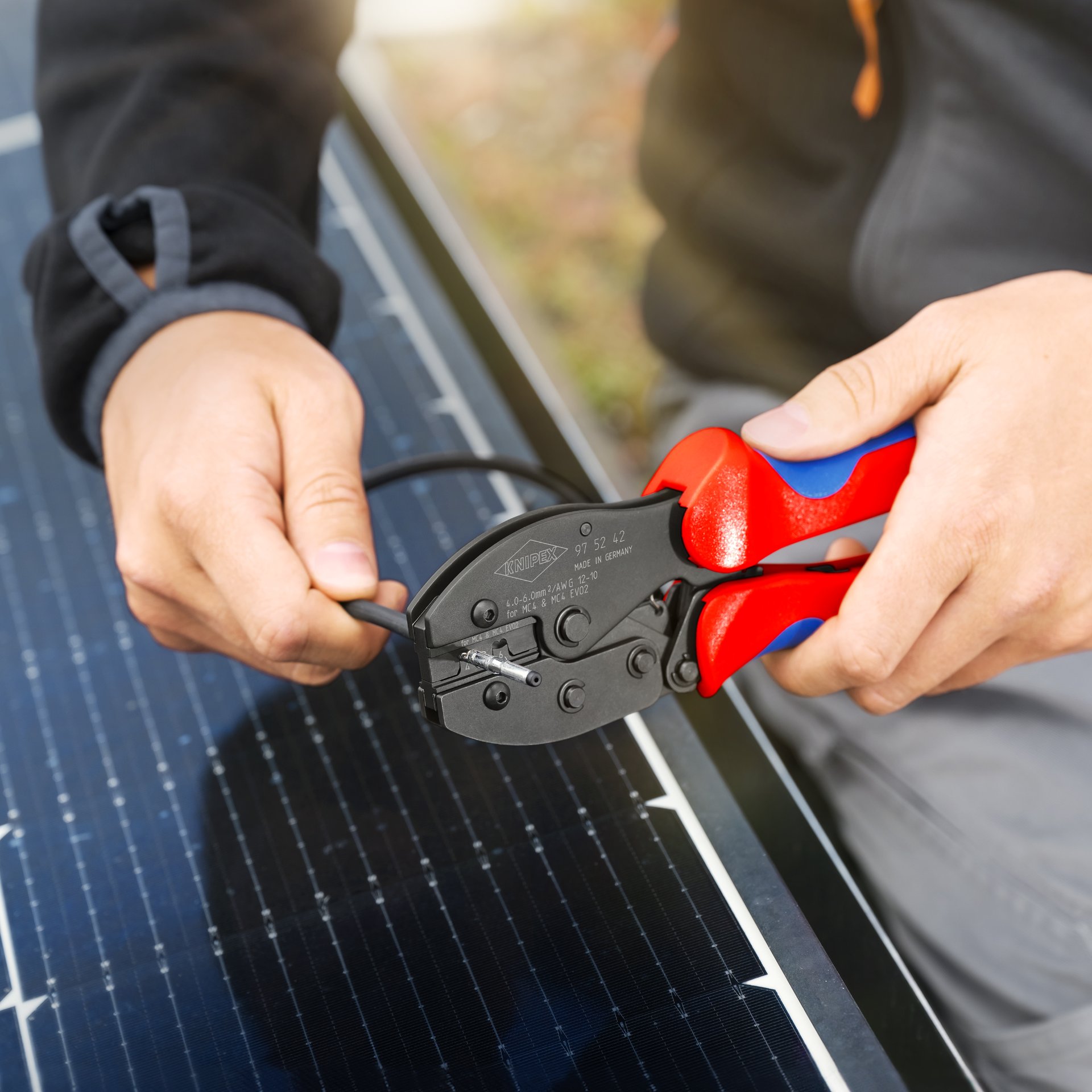 97 52 42 KNIPEX PreciForce® Mit verbesserter Crimp-Geometrie für sehr gute Leitfähigkeit. Gleichbleibend hohe Crimpqualität durch Präzisionseinsätze und Zwangssperre (entriegelbar). Crimpdruck ist werkseitig präzise eingestellt (kalibriert). Hohe Crimpkraft durch effiziente Hebelübersetzung. Gutes Handling durch günstige Griffstellung, geringes Gewicht, kurze Bauform und ergonomisch geformte Griffe. Crimpeinsatz ist nicht wechselbar. für MC4®-/MC4® EVO 2-Verbinder. Zur Installation von PV-Anlagen mit MC4®- und MC4® EVO 2-Verbindern. Für Installationen auf Wohn- und Industriegebäuden oder an Inselanlagen, auch Wohnmobilen. MC4® ist eine registrierte Marke der Stäubli Electrical Connectors AG. - Anwendung: für Solar-Steckverbinder MC4® (Multi-Contact) & MC4® EVO2 - Kapazität Quadratmillimeter: 4,0 — 6,0mm² - AWG: 12 — 10