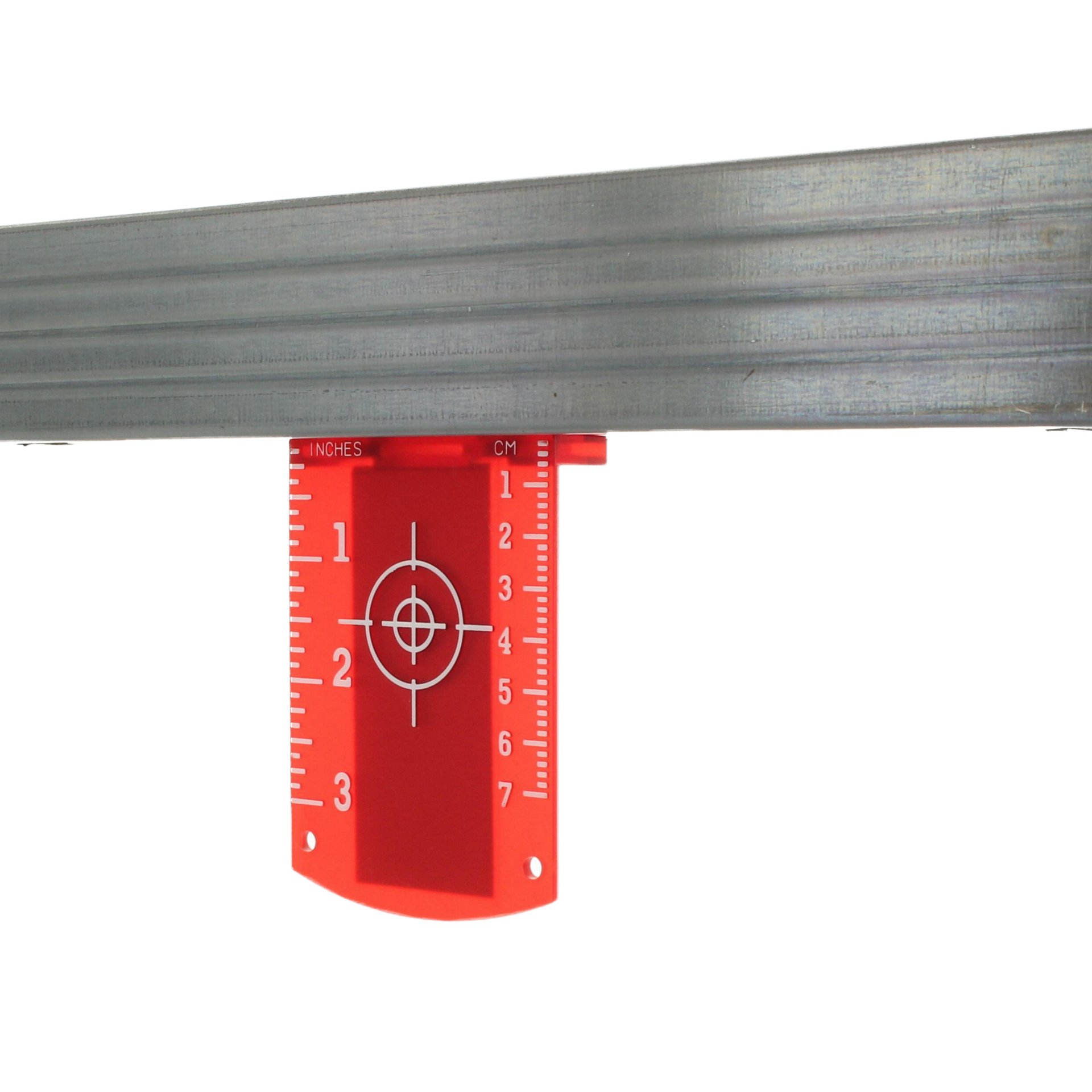 Die Zieltafel erleichtert das Messen auf größere Distanzen da der einfallende Laserstrahl besser reflektiert und so die Sichtbarkeit erhöht wird.