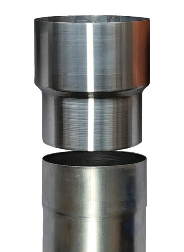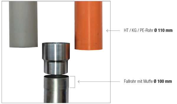 - Zink-Reduzierstück von HT / KG / PE-Rohr ( z. B. Dachgully) Ø 110 mm auf Fallrohr Ø 100 mm mit Muffe