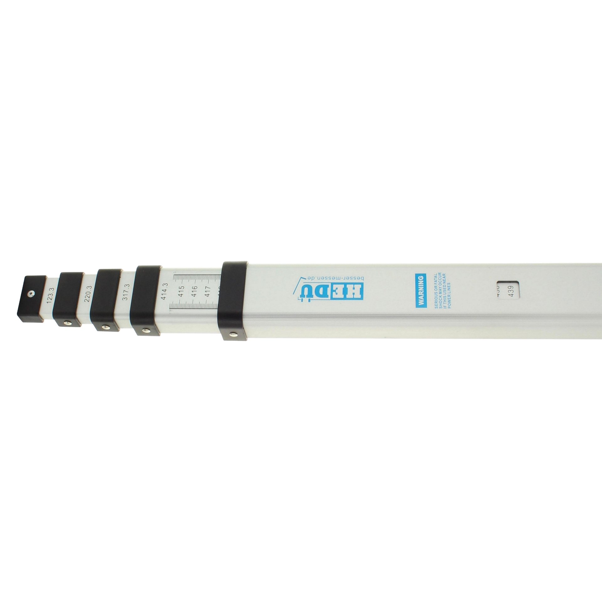 Eine robuste Nivellierlatte aus eloxierten Aluminium-Profilen mit Teleskopauszug. Geeignet sowohl für Nivellierarbeiten auf Baustellen oder im Gelände als auch zum Messen von lichten Maßen. Auf der Vorderseite ist eine E-Teilung zum Nivellieren aufgebracht und auf der Rückseite Millimeterteilung zum Messen von Höhen und Breiten.