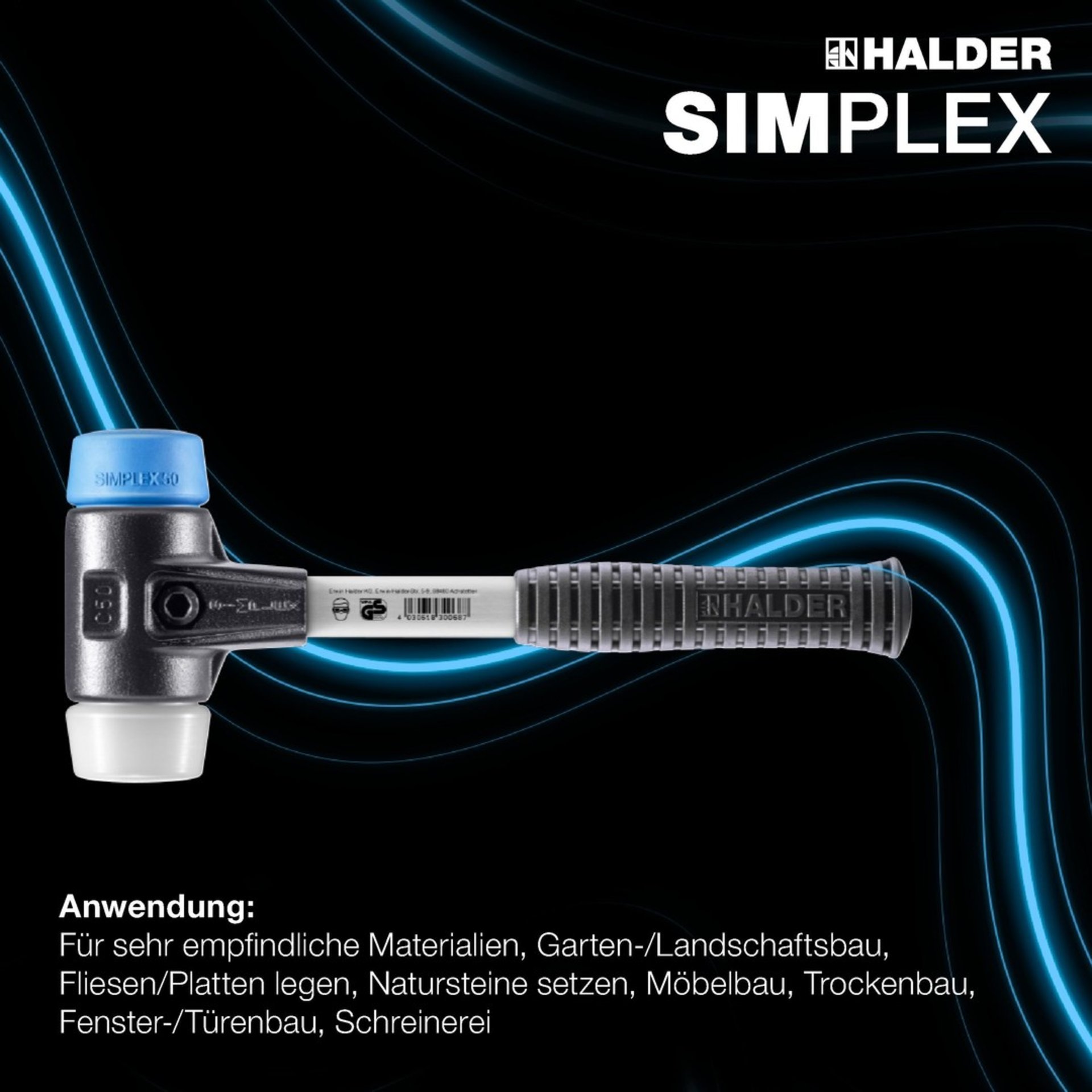 - SIMPLEX–Schonhammer in der Einsatzkombination TPE-soft (blau, weich, abriebfrei) / Superplastik (weiß, mittelhart, sehr widerstandsfähig).